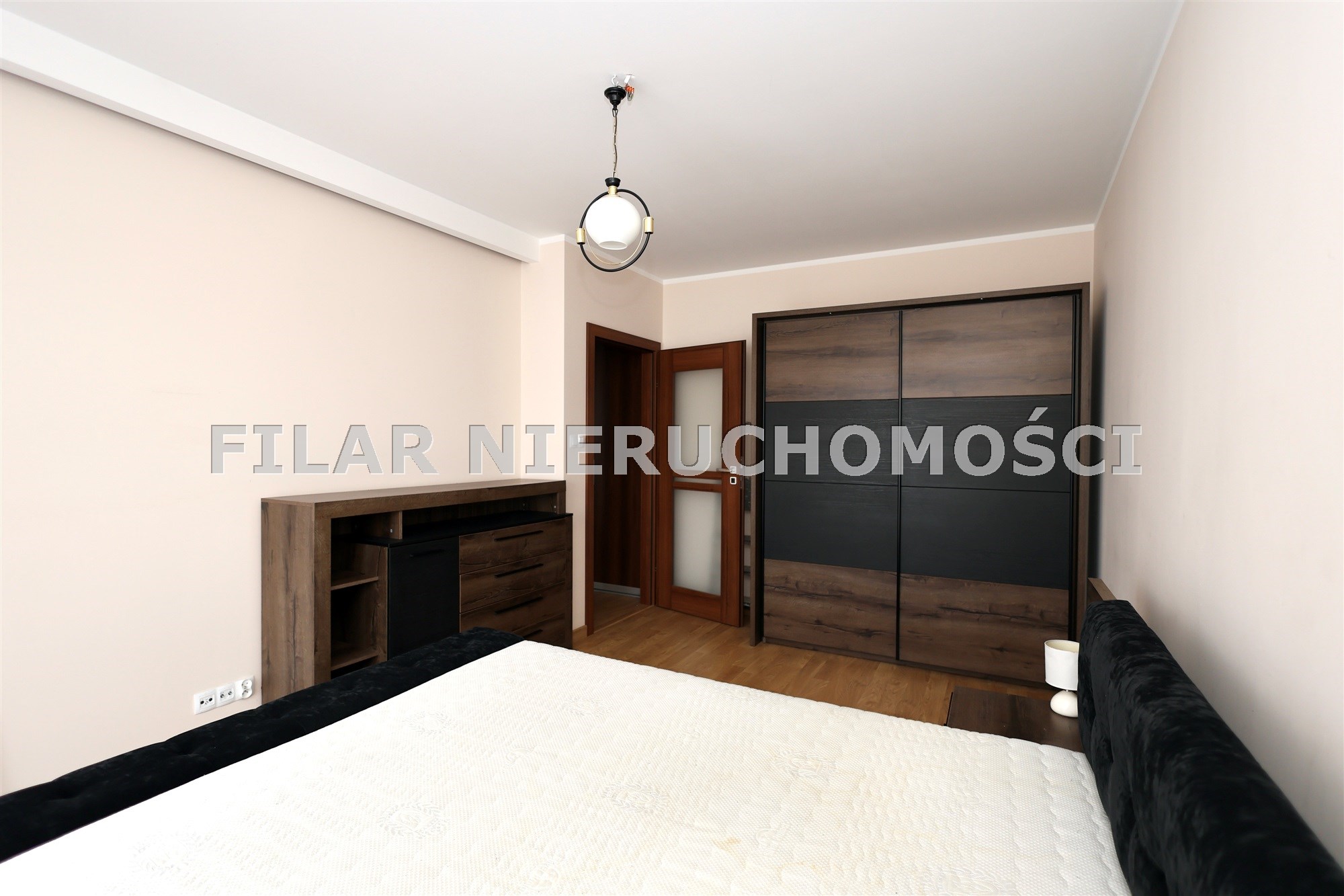 - sypialnia z dużą szafą i łóżkiem z wyjściem na balkon