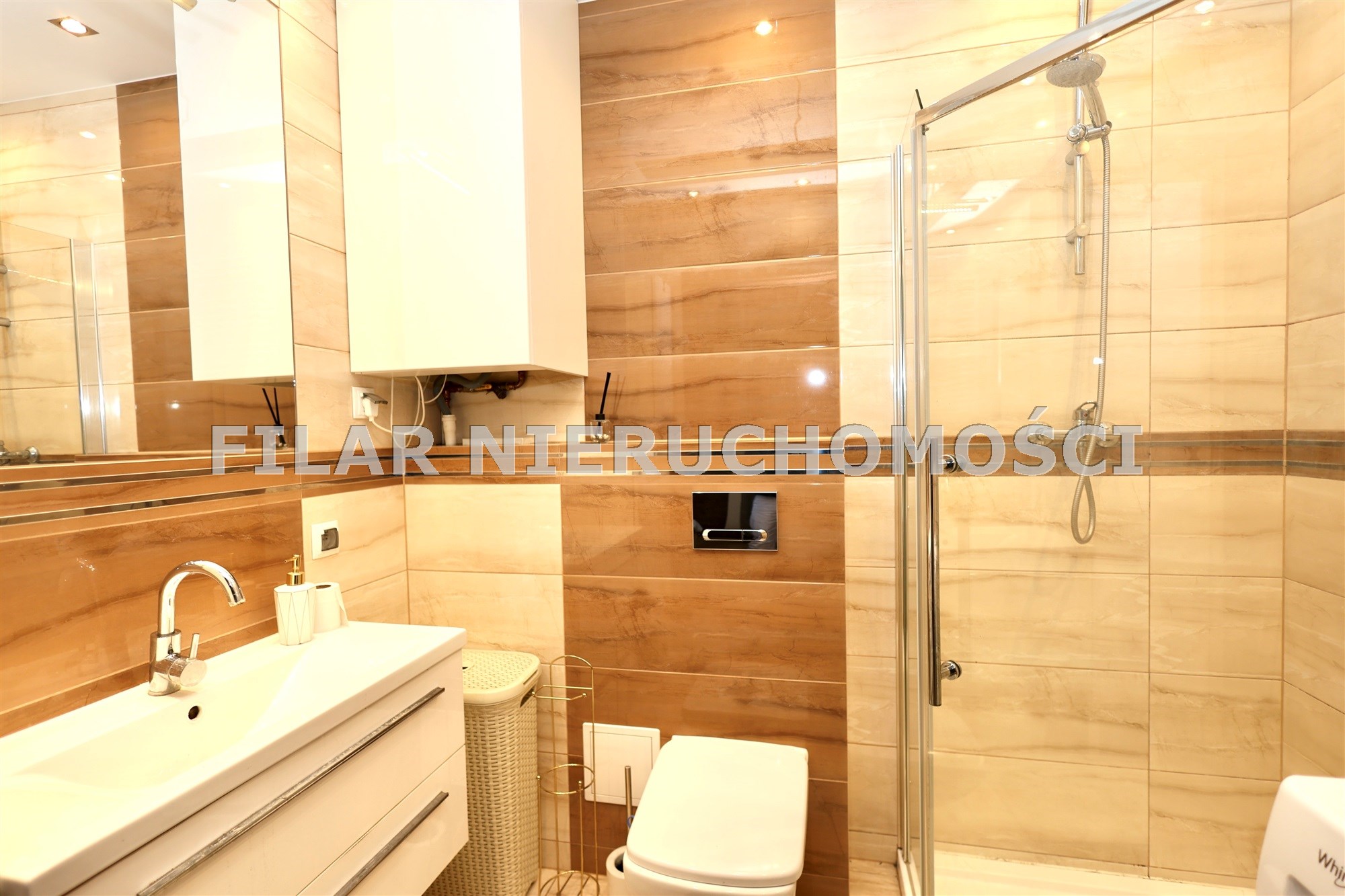 - łazienka ze szklanym prysznicem, umywalką, WC i pralką