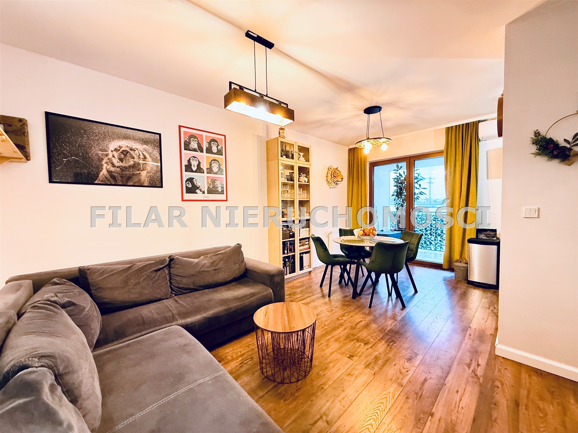 Przestronny salon połączony z kuchnią doskonale doświetlony szerokimi drzwiami balkonowymi prowadzącymi na duży balkon z widokiem na tereny zielone