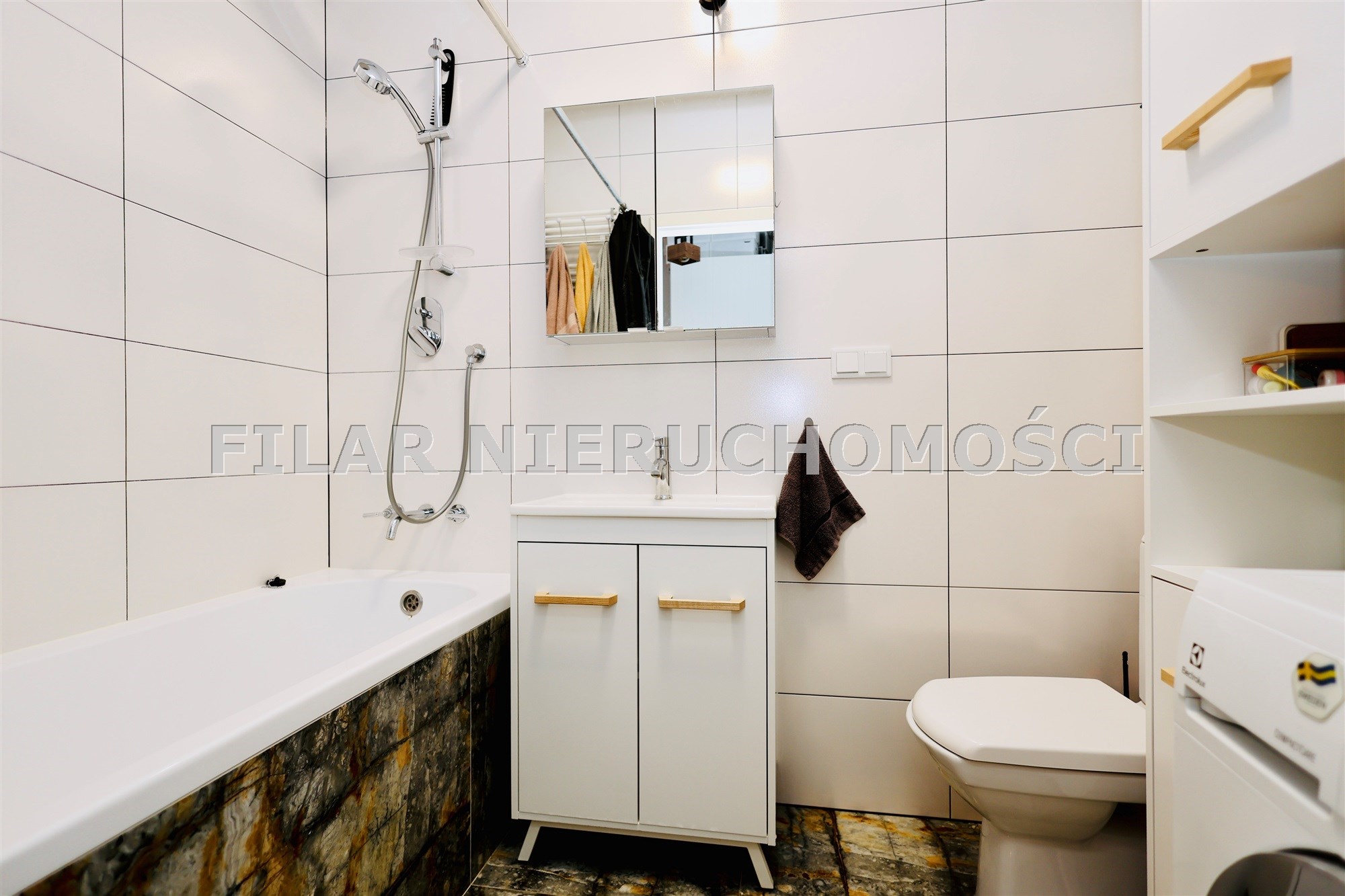Łazienka funkcjonalnie zaprojektowana, z zabudową meblową i miejscem na pralkę.