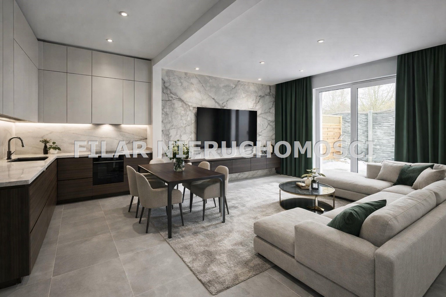 salon z aneksem kuchennym z wyjściem na taras i ogródek,