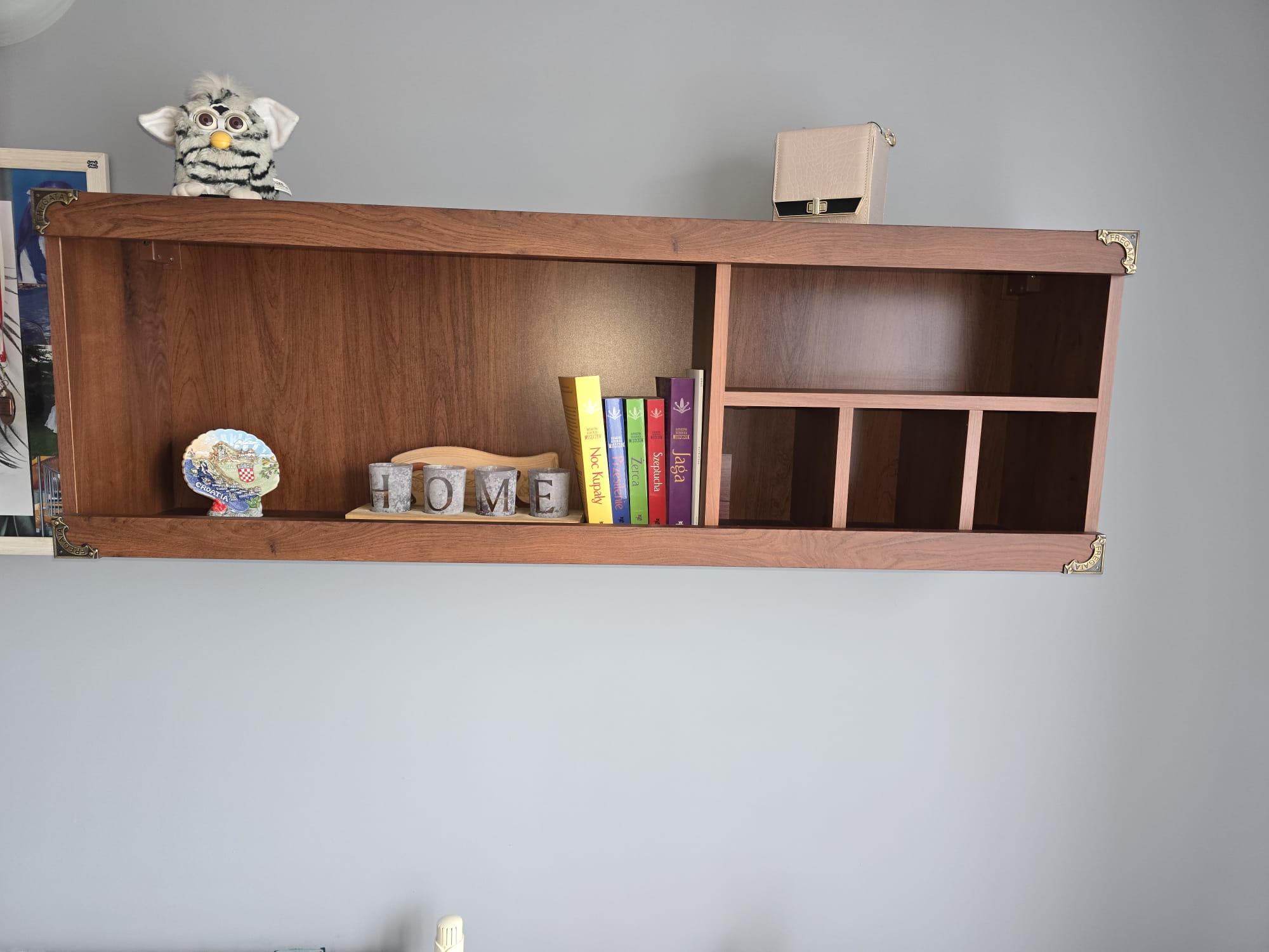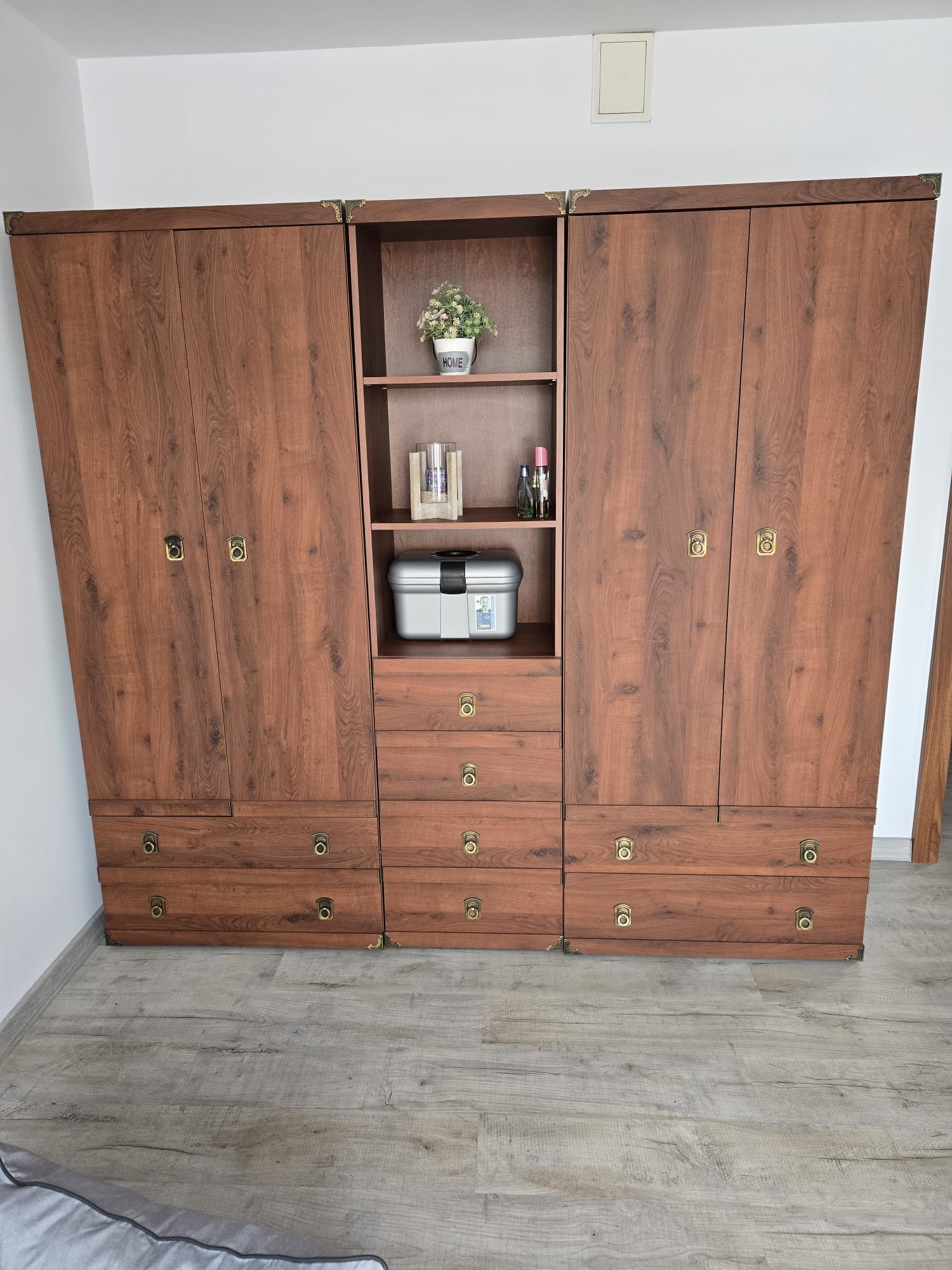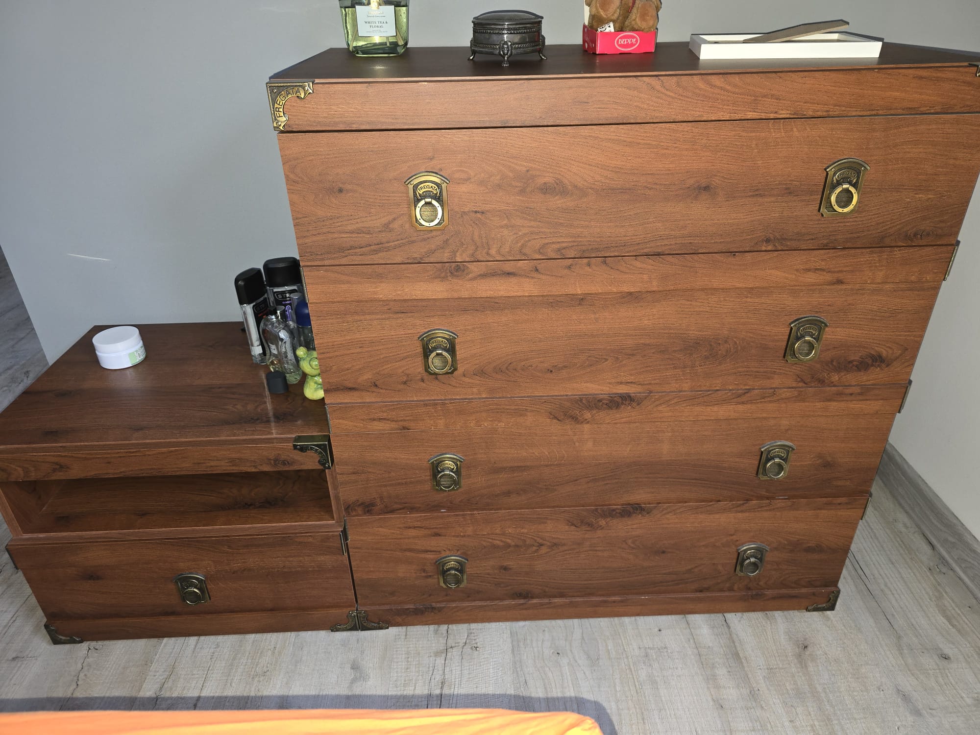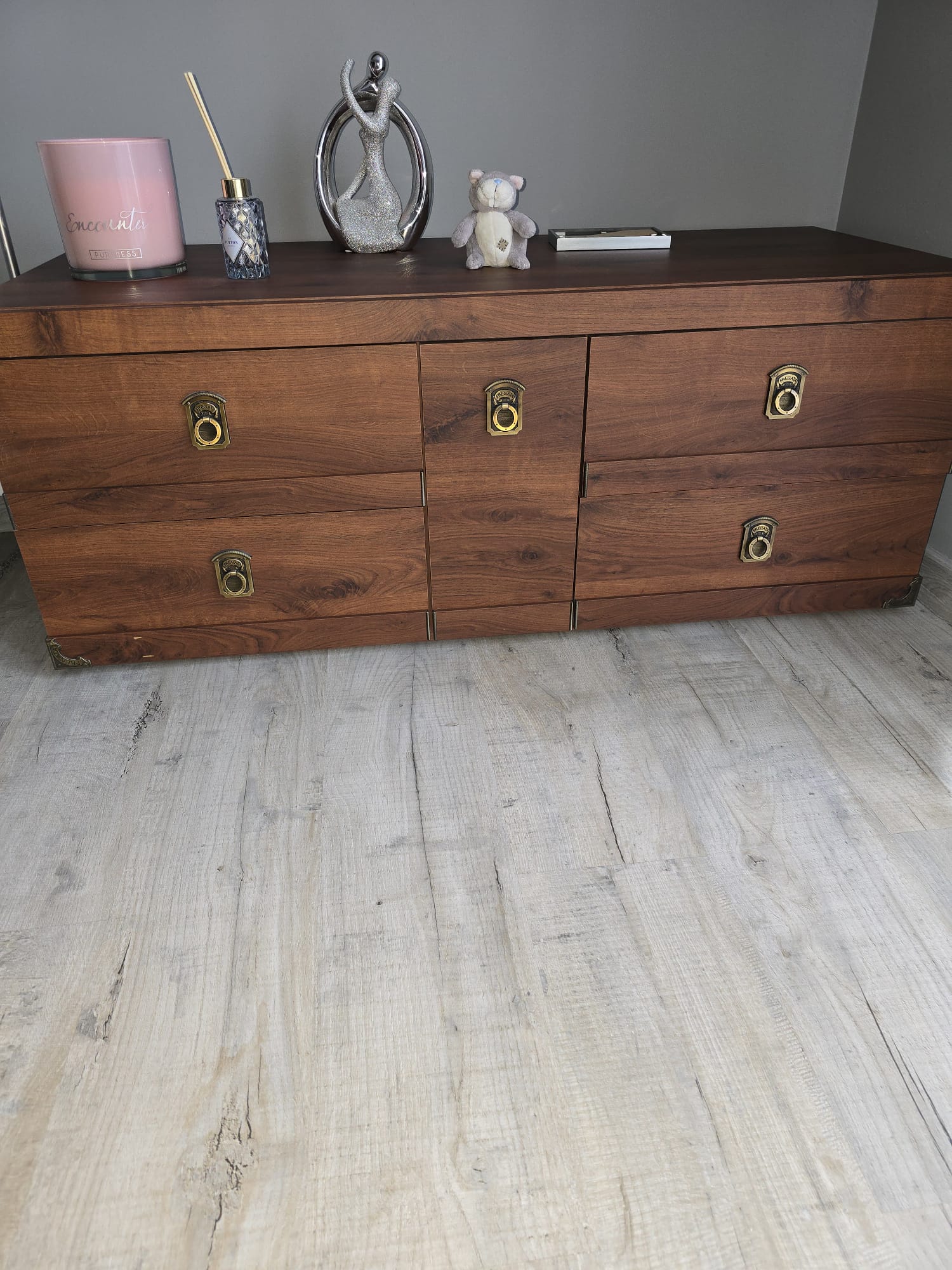 Do sprzedania komplet mebli, w skład wchodzą dwie szafy, witryna, komoda, komoda niska oraz półka.