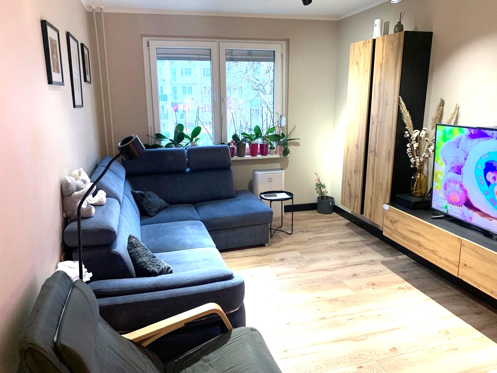 Z okien sypialni i salonu rozciąga się przyjemny widok na plac zabaw i zieleń – idealnie dla osób ceniących spokój i kameralną atmosferę.