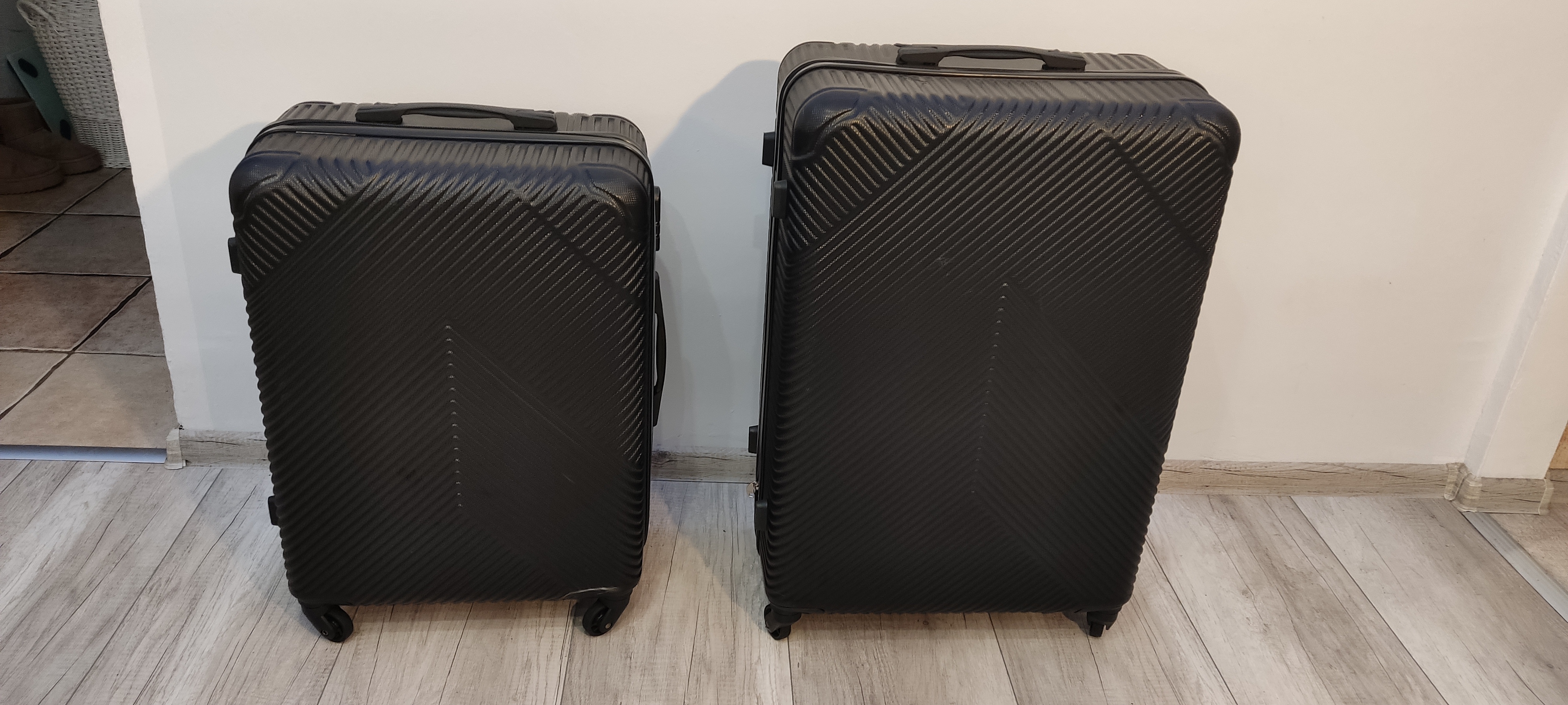 Zestaw dwóch walizek podróżnych w kolorze czarnym. Walizki wykonane są z wytrzymałego materiału, wyposażone w kółka i rączkę ułatwiającą transport. Idealnie nadają się na krótkie i długie wyjazdy. Pojemne wnętrze pozwala na spakowanie niezbędnych rzeczy.